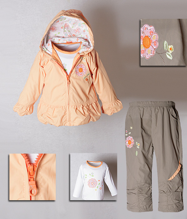 Для девочки. Основной материал: плащевка. Вид рисунка: принт, вышивка. Подкладка: хлопок. Детали: карманы на штанах, низ штанов на стяжках, куртка на молнии спереди. Возраст ребенка: от 1 до 3 лет. Уход: Рекомендуется машинная стирка при 30 градусах