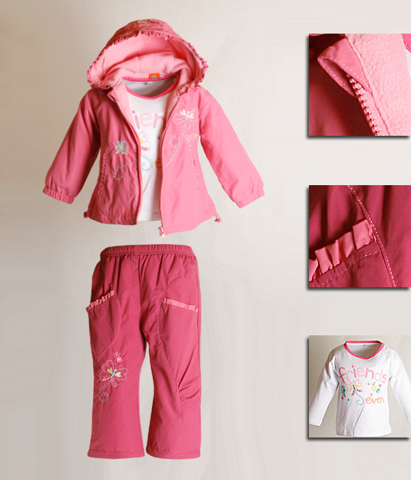 Для девочки. Основной материал: плащевка. Вид рисунка: вышивка, декоративная отстрочка. Подкладка: флис. Детали: куртка на молнии спереди, штаны - пояс на резинке, карманы накладные спереди. Возраст ребенка: от 1 до 3 лет. Уход: Рекомендуется машинная стирка при 30 градусах